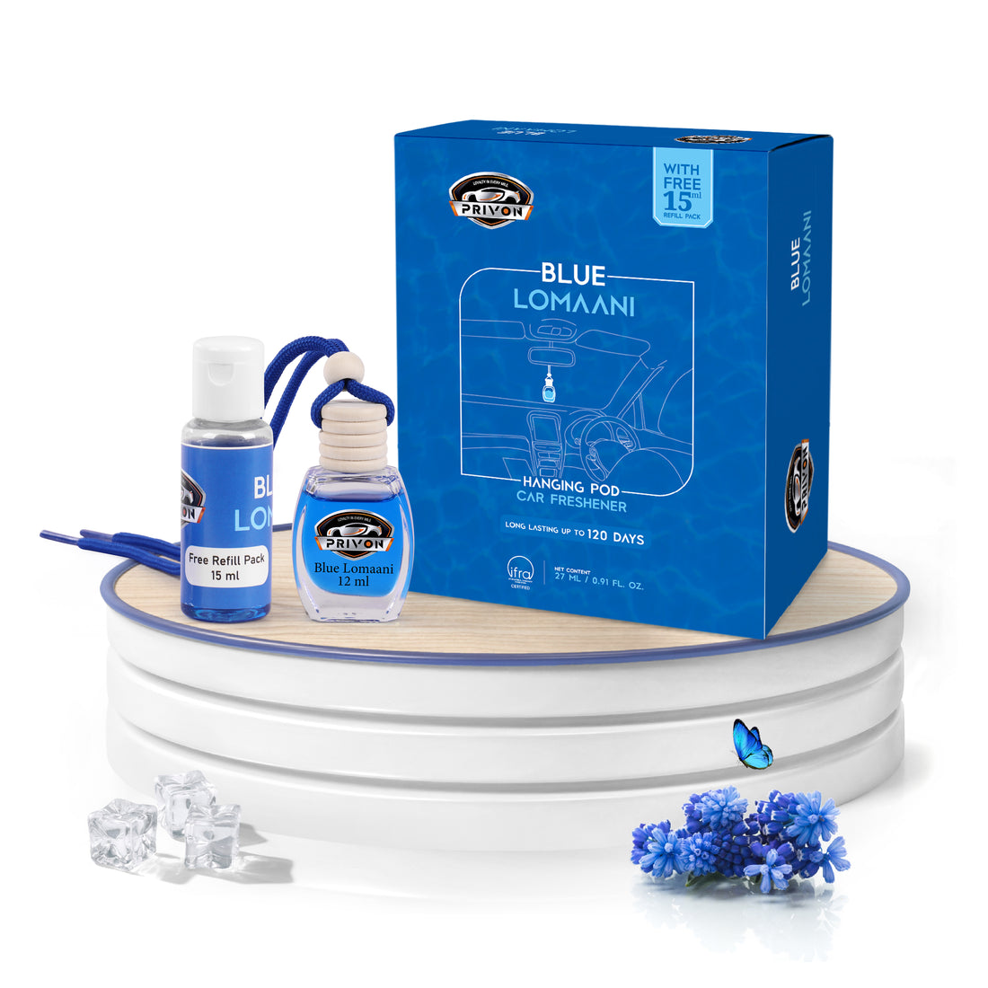 PRIVON Car Perfume Diffuser | 120 Days Long Lasting fragrance | Car Air Freshener Hanging Pod with 15 ml Refill Pack | Natural Organic Essential Oil | 27 ml - pack of 1 (pack of 1, Blue Lomaani)