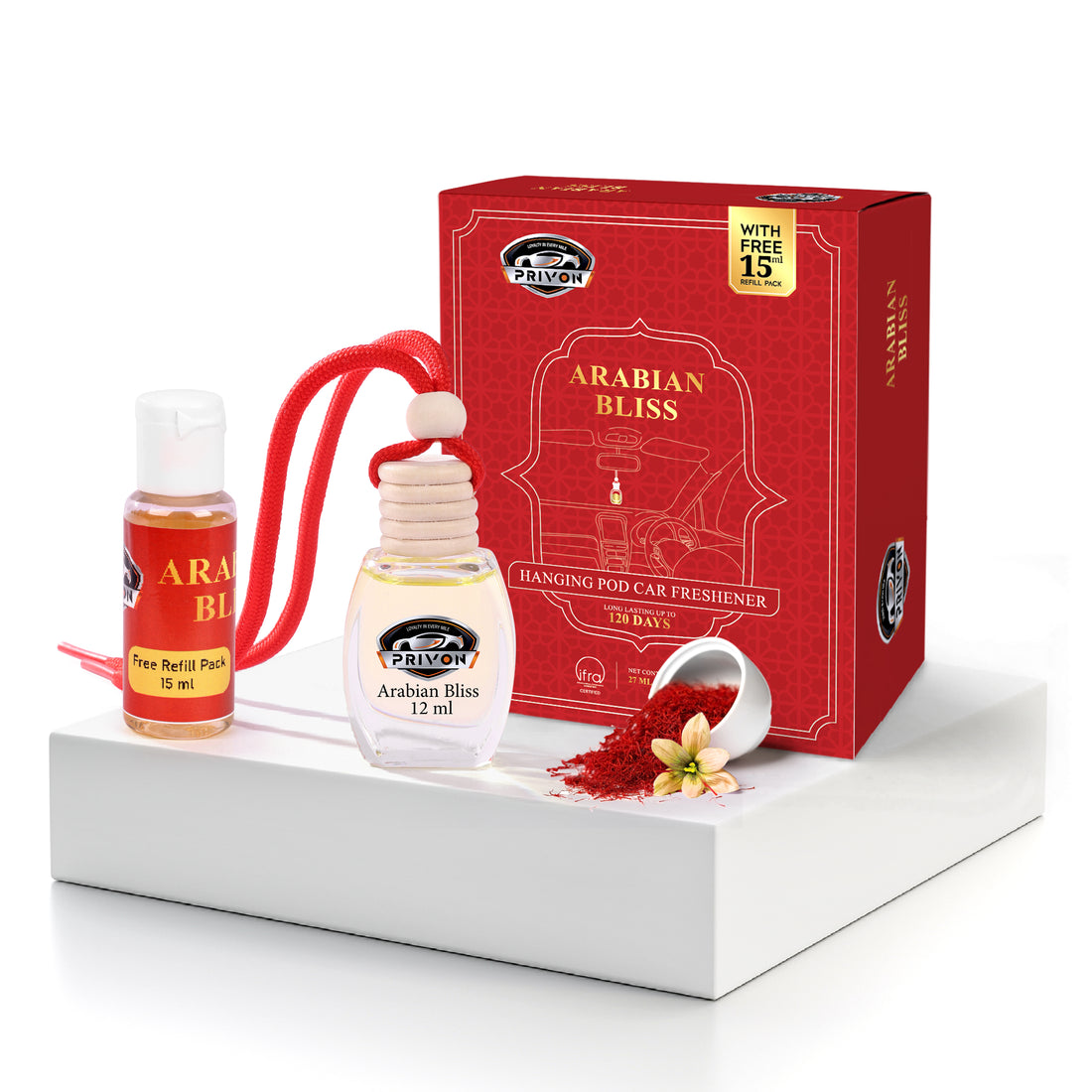 PRIVON Car Perfume Diffuser | 120 Days Long Lasting fragrance | Car Air Freshener Hanging Pod with 15 ml Refill Pack | Natural Organic Essential Oil | 27 ml - pack of 1 (pack of 1, Arabian Bliss)