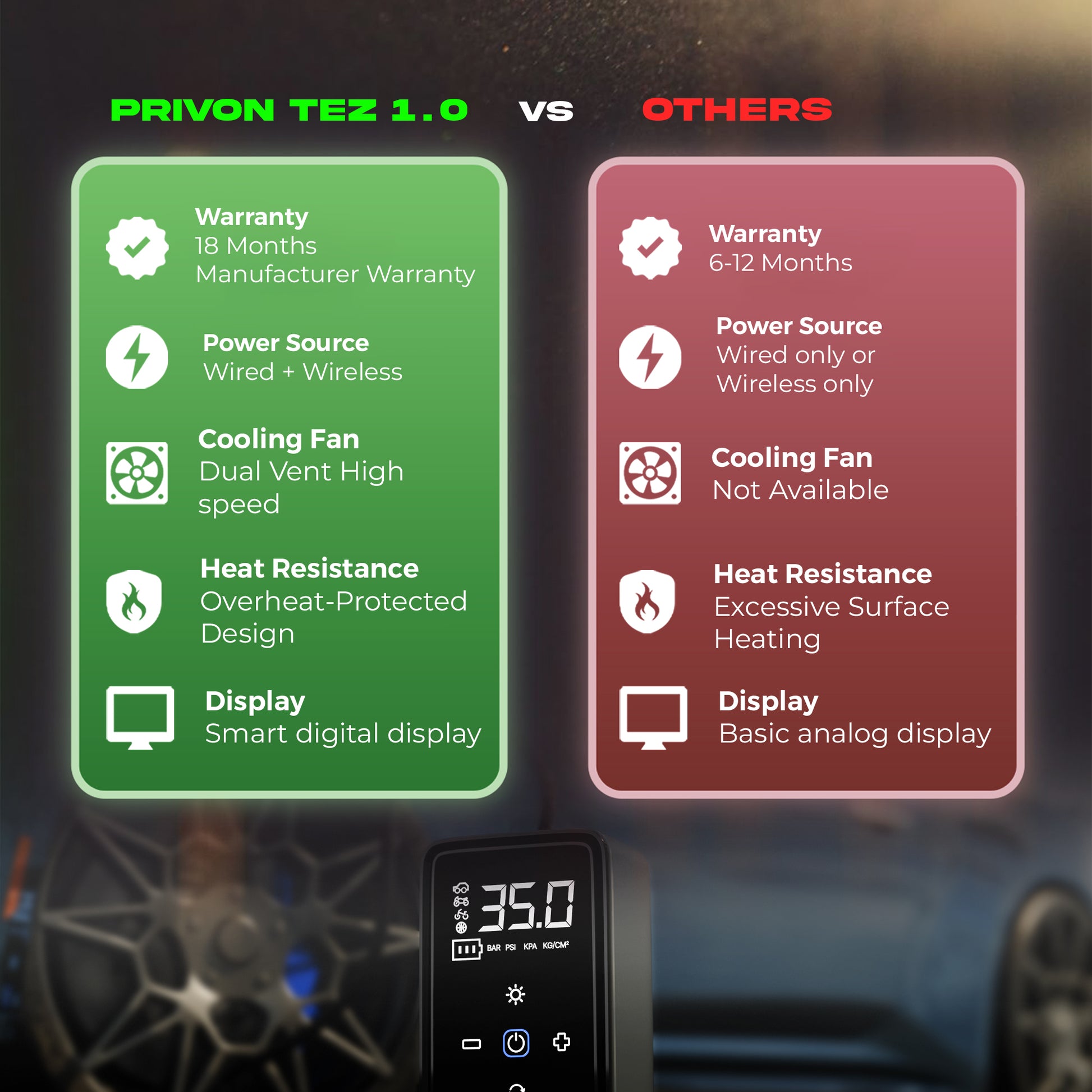 Inflates car tyres from 27–35 PSI in just 50 seconds